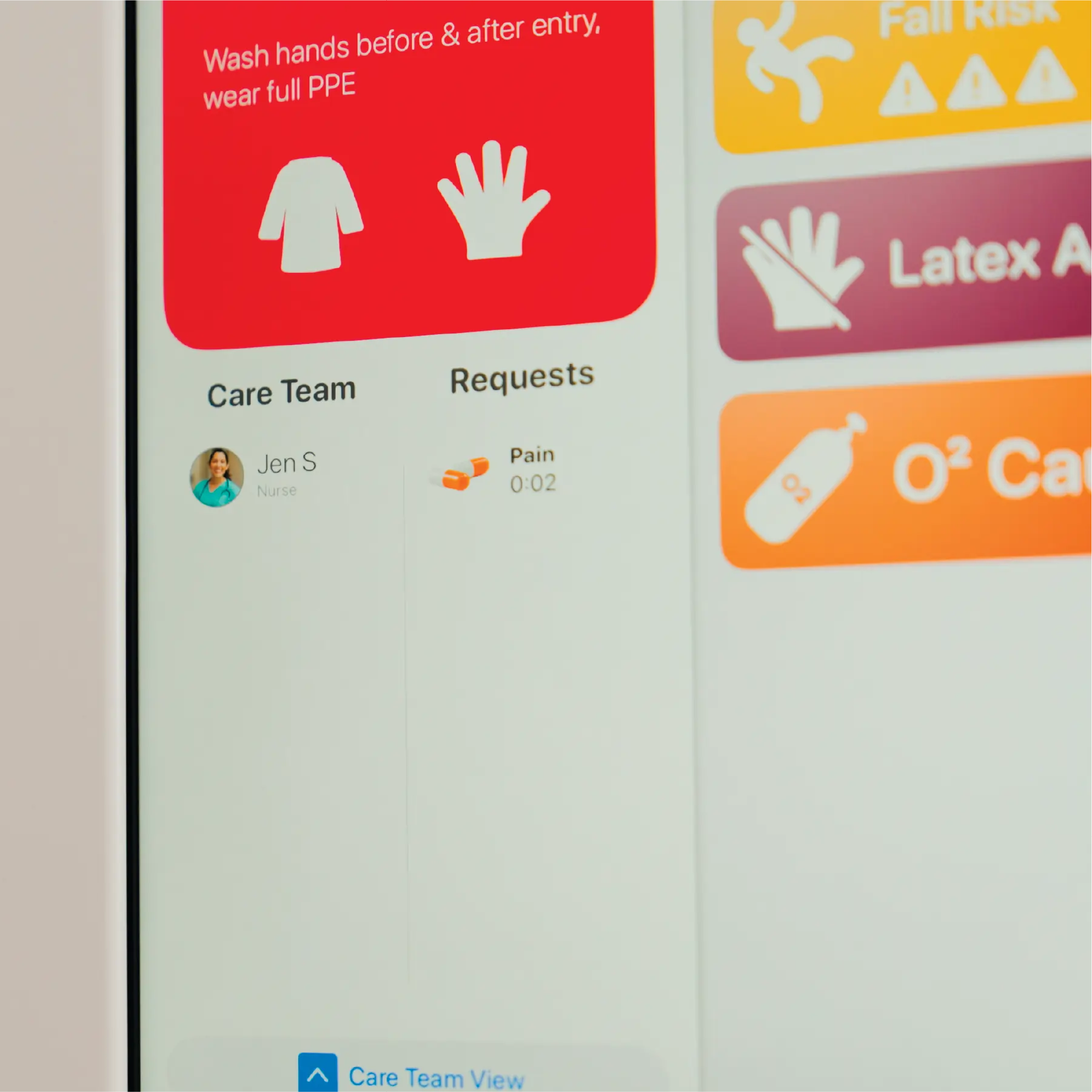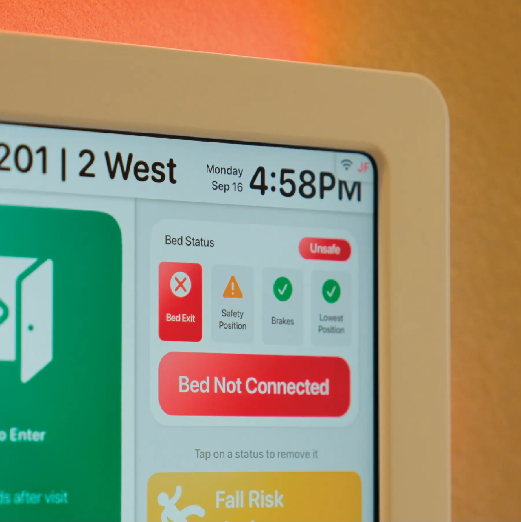 - Continuously synced with the EMR — displays patient status automatically and clears at discharge