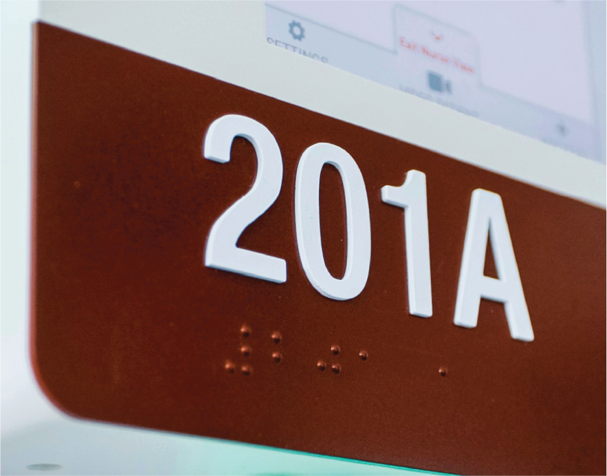 HallMonitor includes raised room numbers and Grade 2 Braille built directly into the enclosure, delivering ADA compliance without separate placards or additional inspections.